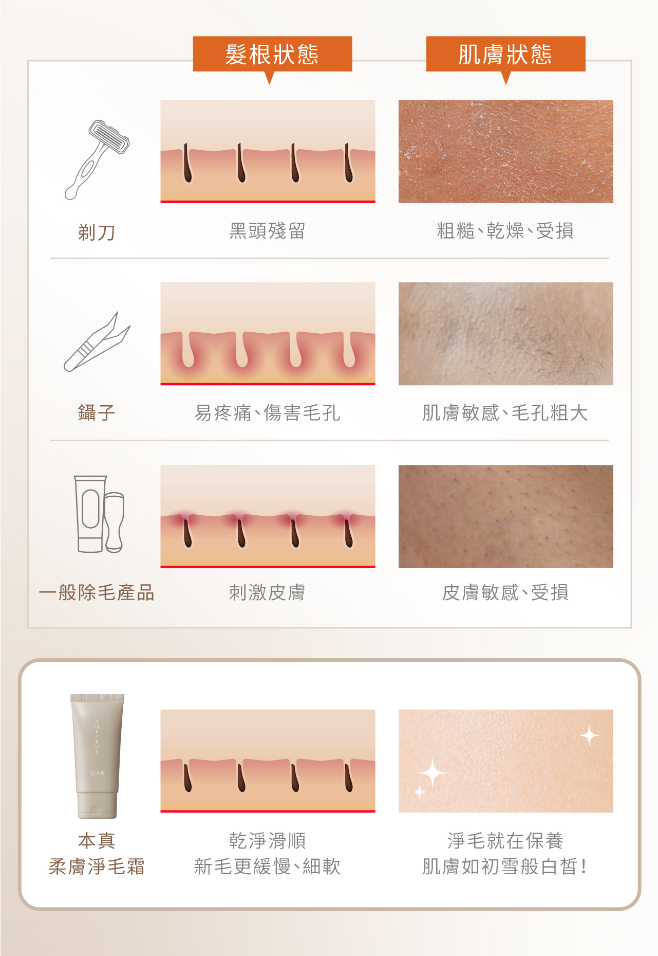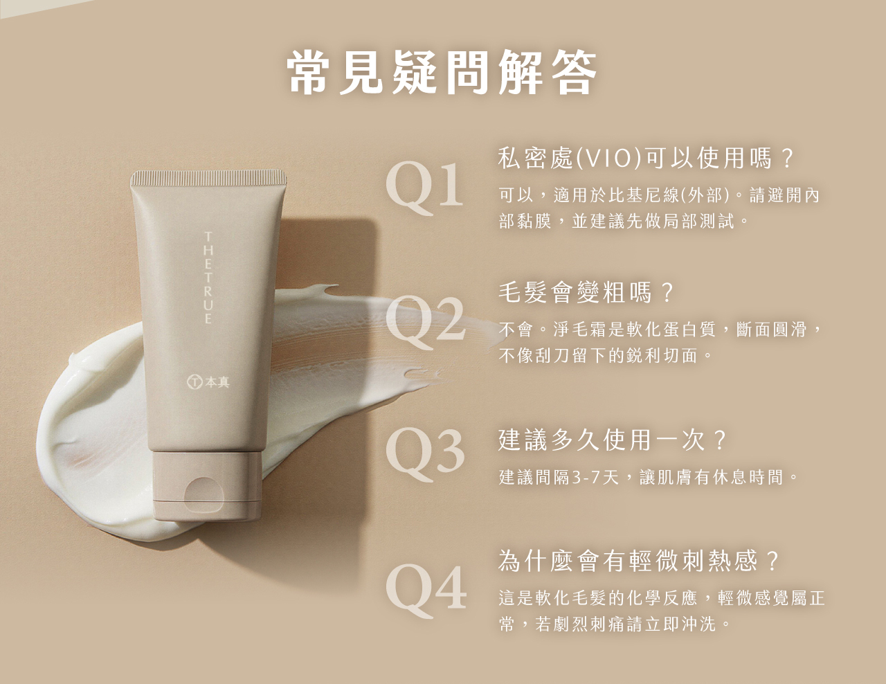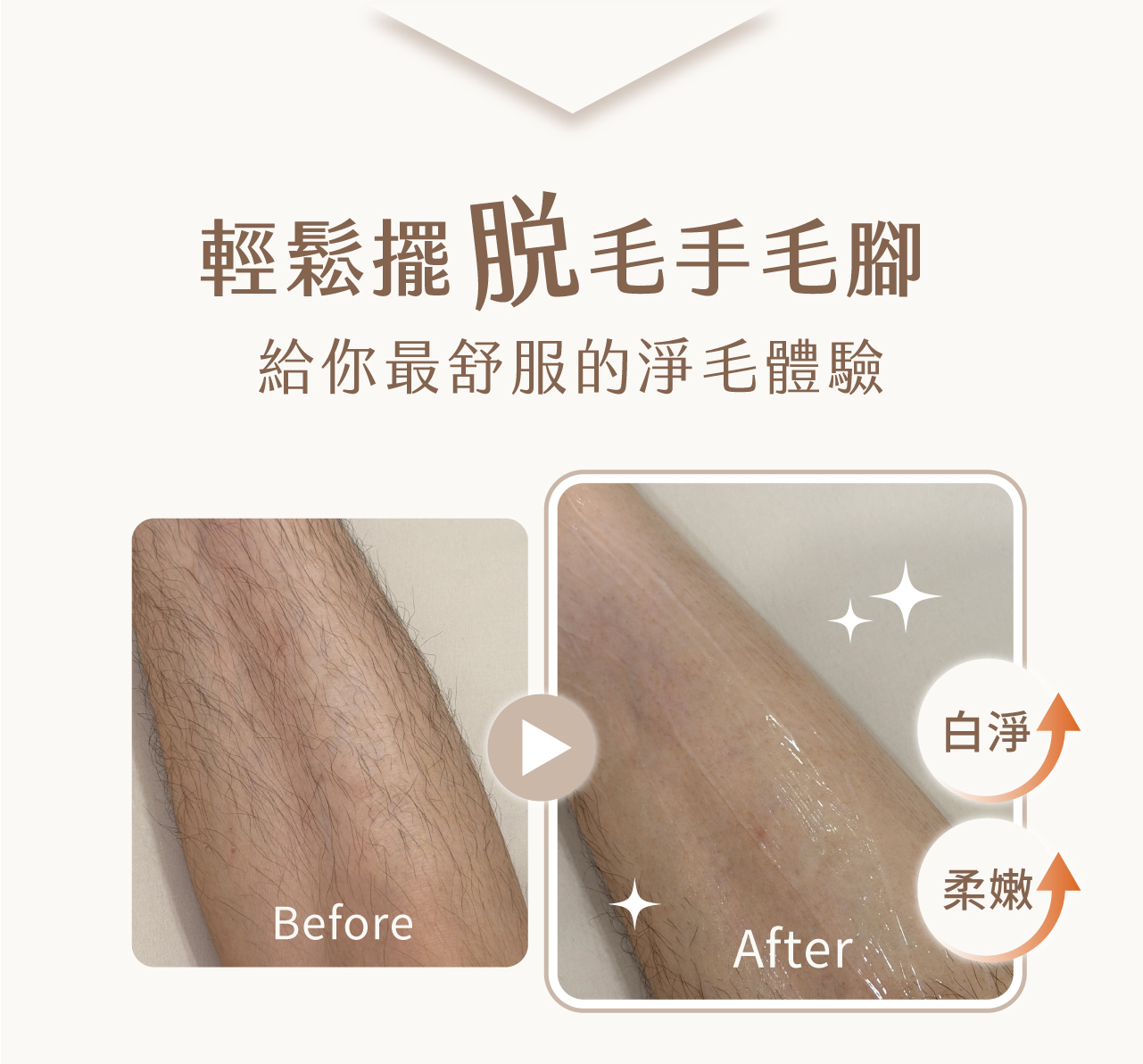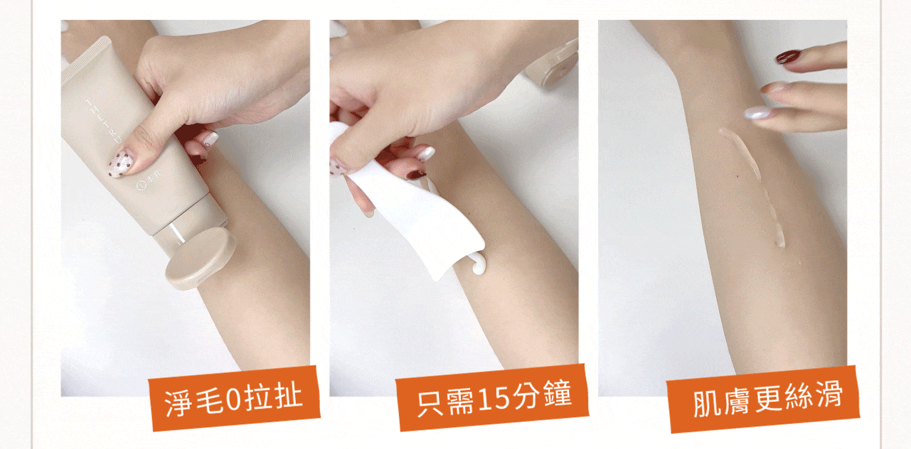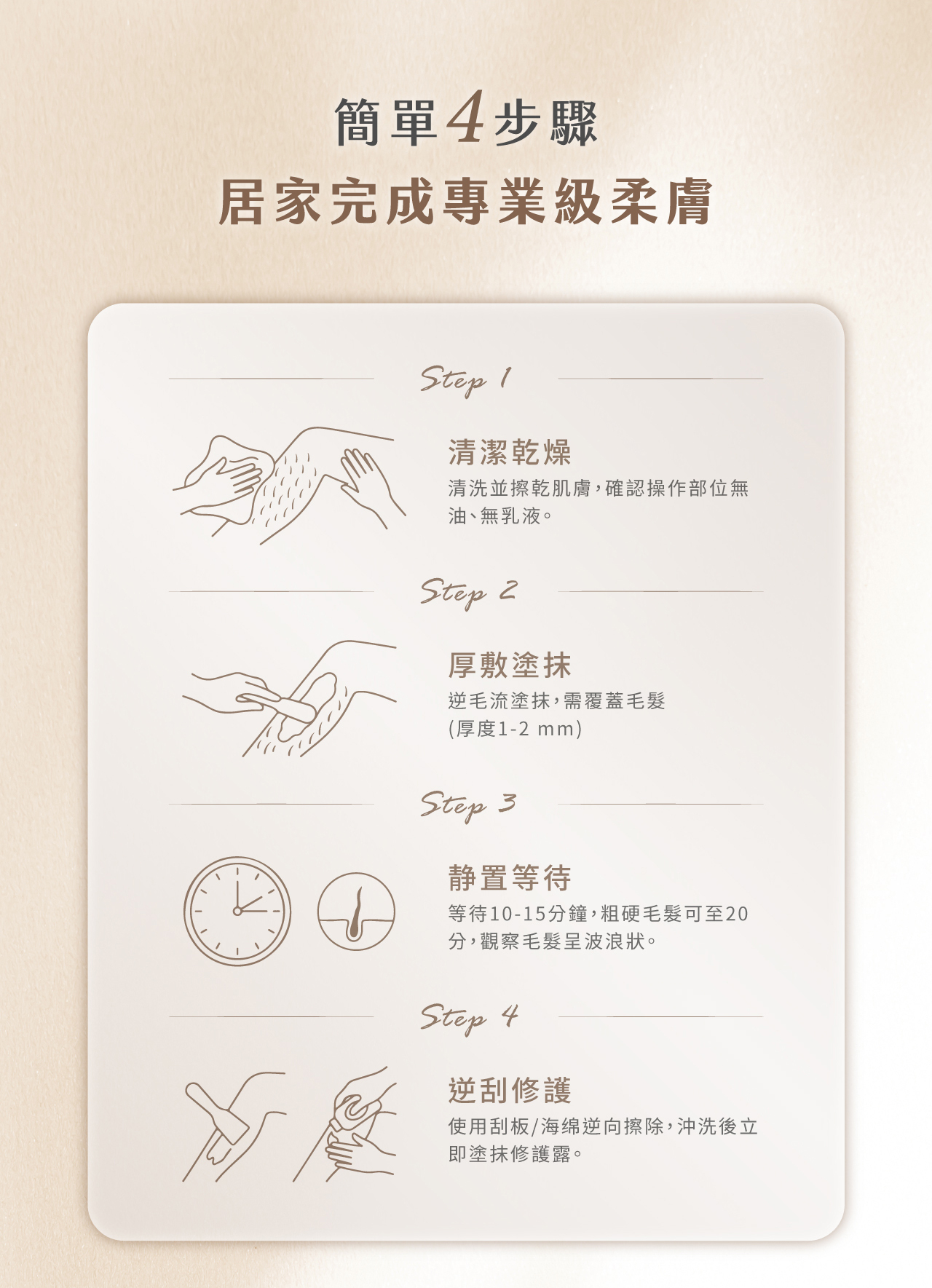 用法:1.以清水洗淨並擦乾欲淨毛部位。2.取適量乳霜,順著毛流方向厚敷,完全覆蓋毛髮。靜置約10-15分鐘;若毛髮較粗硬,可適度延長,勿超過20分鐘。3.刮板以逆毛方向輕柔刮除,或海綿逆毛擦拭乾淨,再用清水徹底沖洗乾淨。4.淨毛後建議搭配「柔膚舒緩修護露」加強補水修護。建議部位:手臂、腿部、背部、比基尼線周圍。