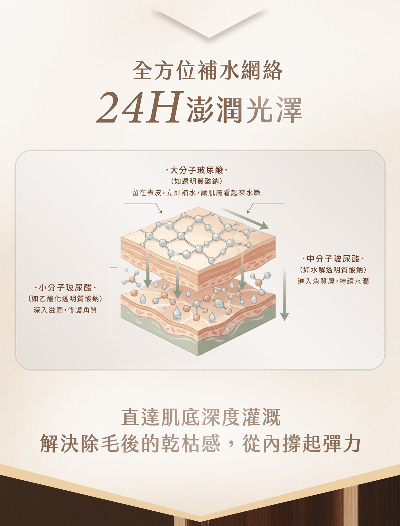 淨毛後肌膚的舒適守護,瞬間補水,多重玻尿酸讓肌膚柔嫩光澤;積雪草、綠茶、洋甘菊萃取舒緩乾燥不適;蜂王乳蛋白與南瓜籽精萃滋養修護,肌膚柔滑舒適、明亮均勻。